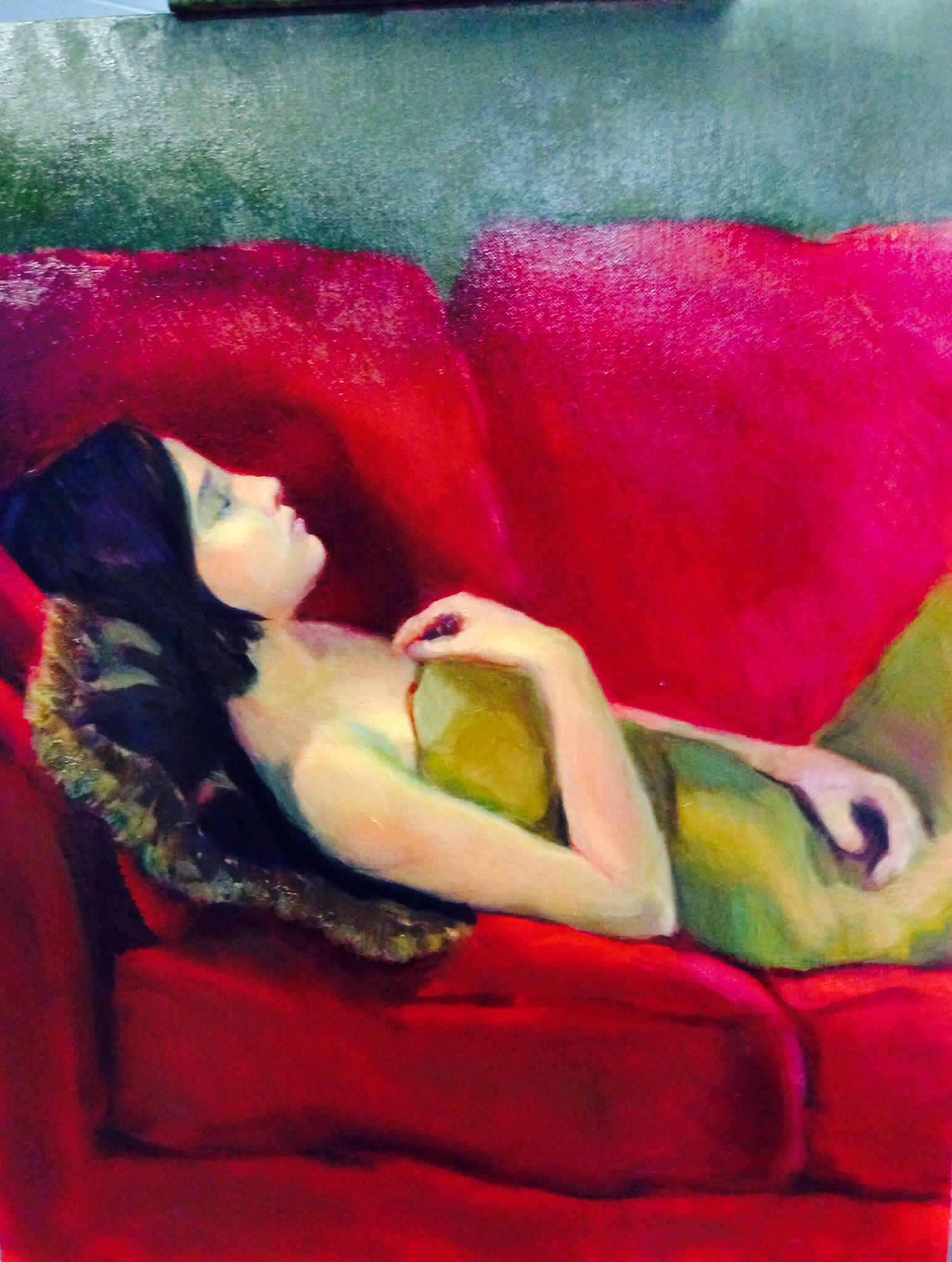 A marvelously accomplished painter has told me the only good feature of this painting is the model’s left hand, which he called the mark of an artist. The rest he dismisses as the careful work of a student concerned with doing well. That I do admit occurs to me as I paint: is that then a fatal flaw? He further scoffs that the sofa looks “massaged.” My greatest failing, I suppose, is to be so awed as to be intimidated to the point that I cannot ask questions to learn more about what he means.
